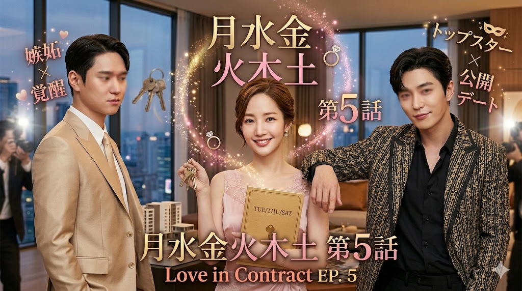 完璧な非婚を実現する契約結婚マスターと、月・水・金の長期独占契約顧客、そして火・木・土の新規契約顧客が織りなす大人のラブコメディ『月水金火木土』第5話のネタバレあらすじ、キャスト、見どころを詳しく解説!ヘジン(キム・ジェヨン)の突発的な結婚...