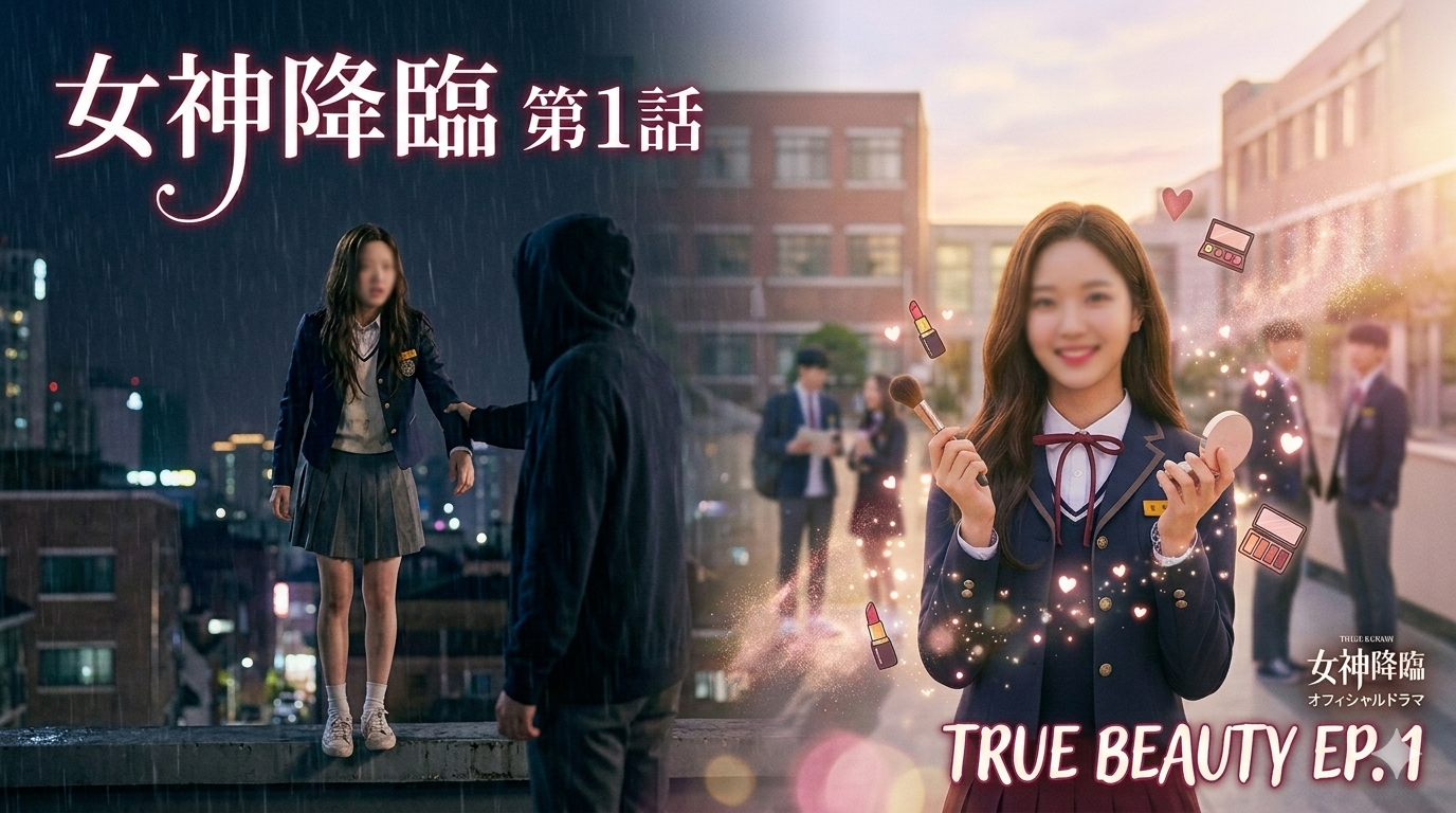 大ヒット韓国ドラマ『女神降臨』記念すべき第1話のネタバレあらすじ、キャスト、見どころを詳しく解説!外見のせいでひどいいじめを受けていたジュギョン(ムン・ガヨン)が、血の滲むような努力でメイク術を習得し、誰もが振り返る「女神」へと変身する爽快なストーリーの幕開けです。謎の冷酷イケメン・スホ(チャウヌ)との屋上での衝撃的な出会いも必見!本作をお得に全話視聴するなら、U-NEXTの31日間無料トライアルがおすすめです。